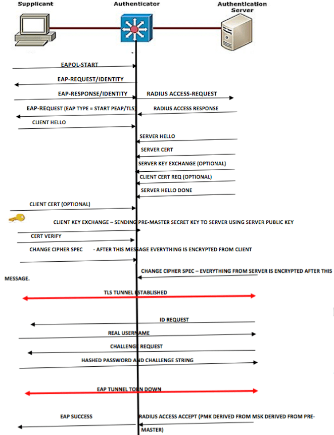 All the communications between the Supplicant and Authenticator occurs via EAP protocol and RADIUS protocol is used for data exchange between Authenticator and AS. Any EAP message going from Authenticator to the Supplicant is called EAP Request and the response message that comes back from the Supplicant to the Authenticator is the EAP Response. Similarly, the message that goes from Authenticator to the AS is called RADIUS Access Request and the response back is the RADIUS Response. The two main purposes of a Dot1x Authentication is 1. Validate the client user identity 2. Generation of PMK (Pairwise master key).