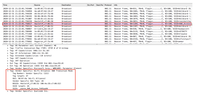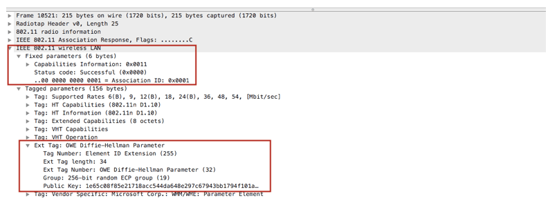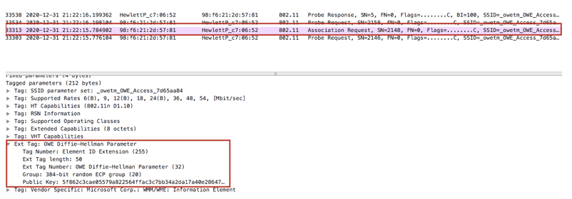 Packet captures show additional IE : Wi-Fi Alliance OWE Transition mode in the beacon and OWE Diffie-Hellmann parameter in the Assoc exchanges for the OWE client device.
